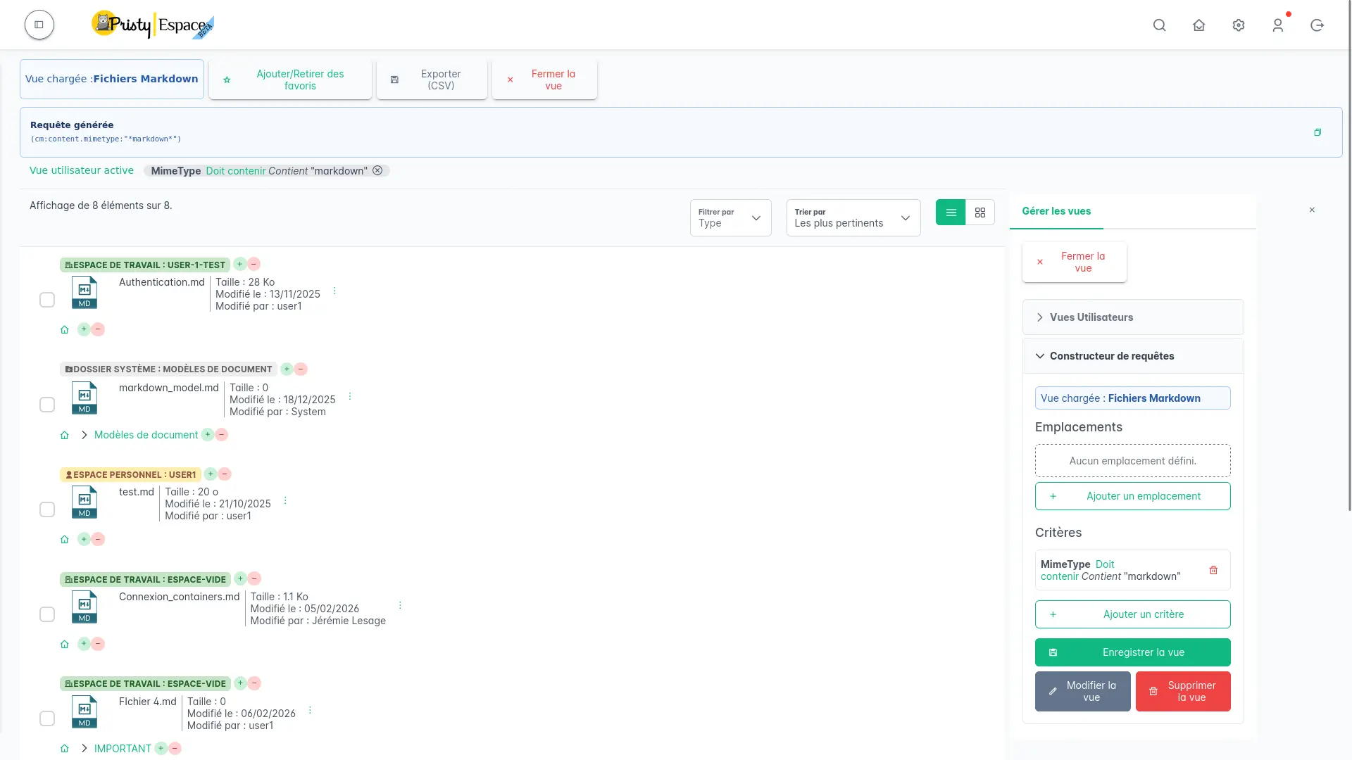 Les vues utilisateur Pristy Espaces sont des recherches personnalisées sauvegardées — des raccourcis vers l’information dont vous avez besoin, accessibles en un clic depuis le menu.